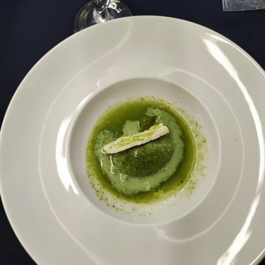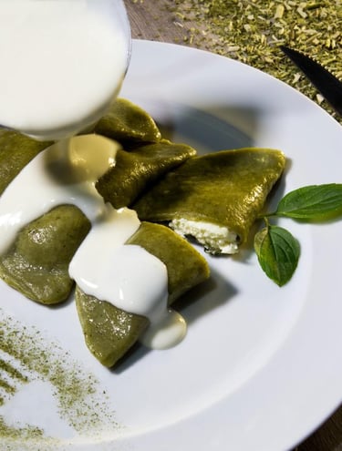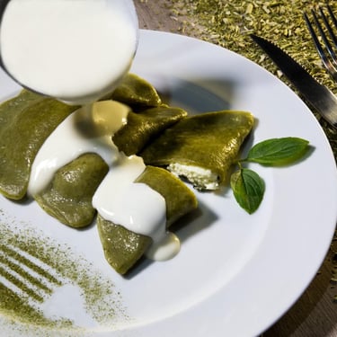 Pierogi de Erva-Mate recheado com requeijão caseiro, tomate seco e manjericão